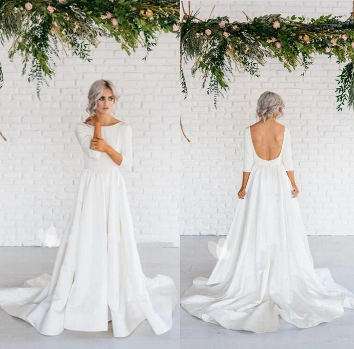 Simple Designed 3/4 Long Sleeve Boho Wedding Dresses A Line Scoop Neckline Backless Long Satin Summer Garden Beach Bridal Gowns Plus Size