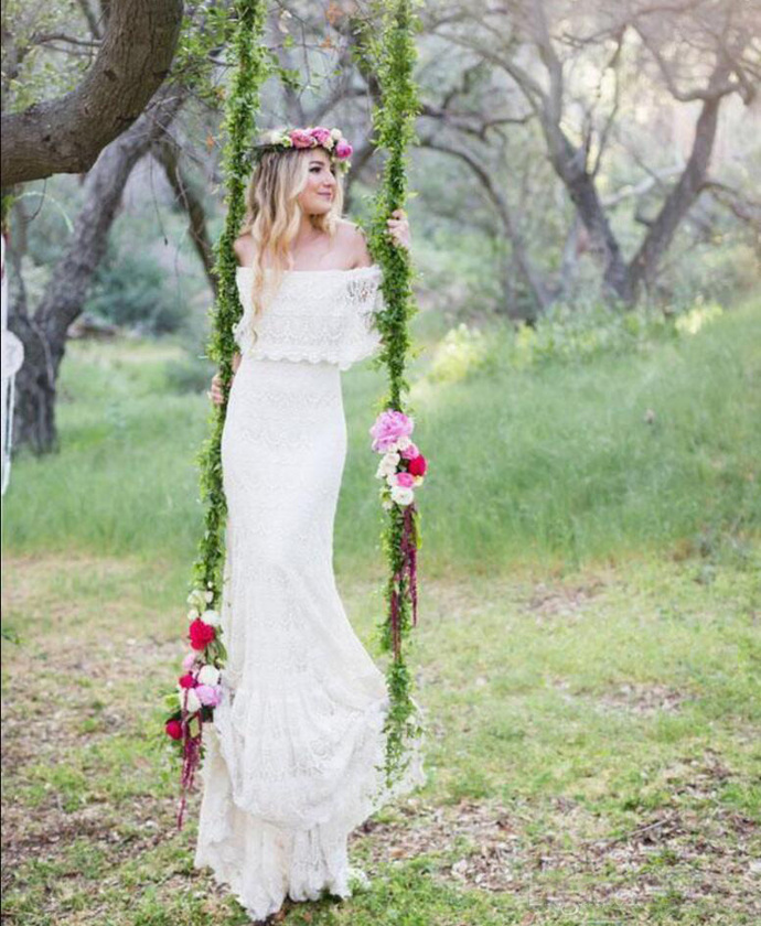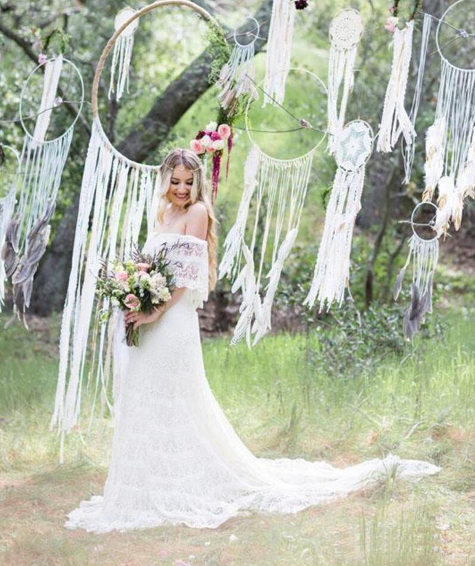 Romantic Off the Shoulder Bohemian Wedding Dresses Sweep Train Lace Garden Beach Bridal Gowns Custom Made Plus Size Boho Wedding Gowns