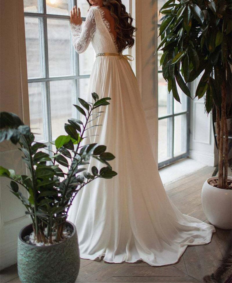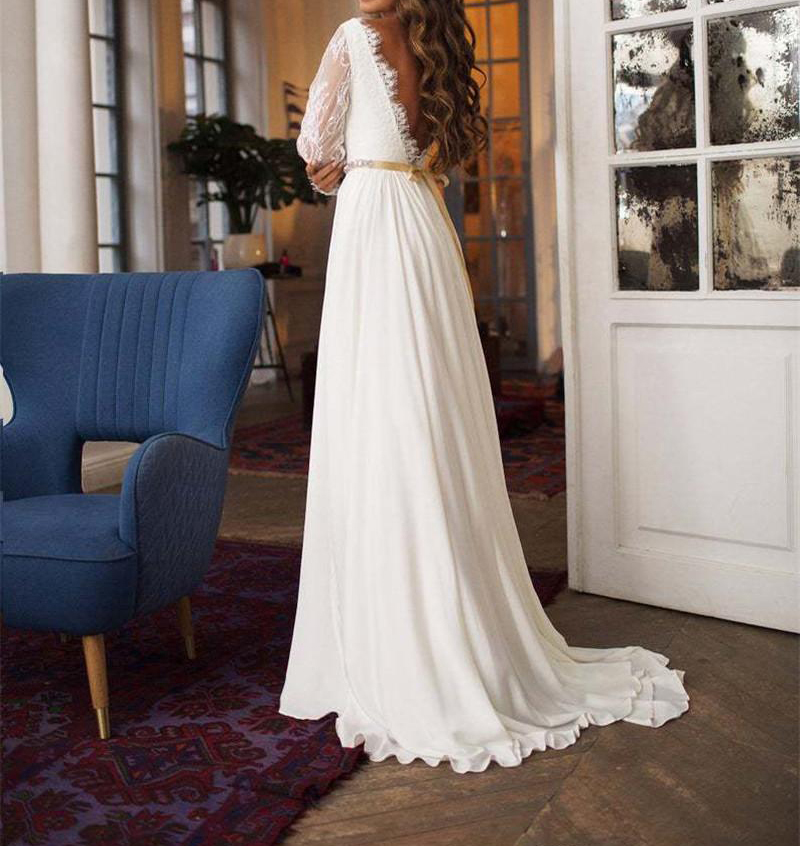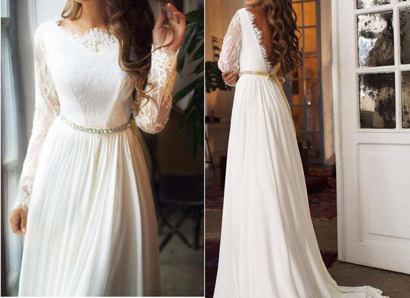Long Sleeves Lace Bateau A-line Chiffon Beach Wedding Dresses Eleagnt Open Back Beach Bohemain Bridal Gown