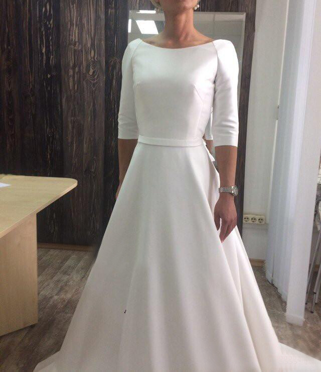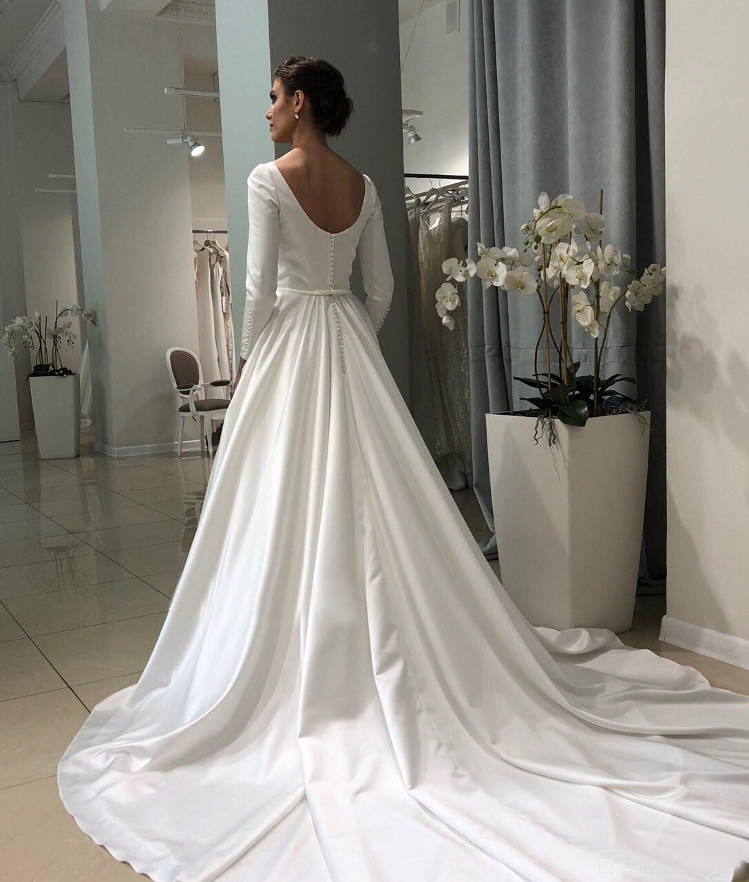 Boat Neck Long Sleeves Covered Button Back Sweep Train Stain Wedding Dresses Bridal Gowns