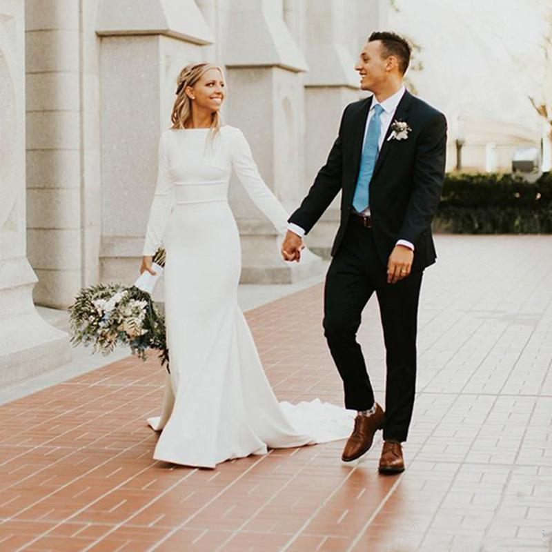 New Fashion Simple Cheap Mermaid Wedding Dresses Long Sleeves Boat Neck Satin Country Style Plus Size Wedding Dress Bridal Gowns
