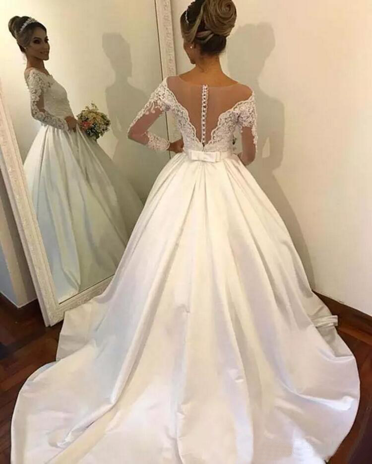 Sheer Neck Lace Top Wedding Dresses With Long Sleeves Button Back Satin Bridal Dresses With Bow Sash Court Train Wedding Gowns For Brides