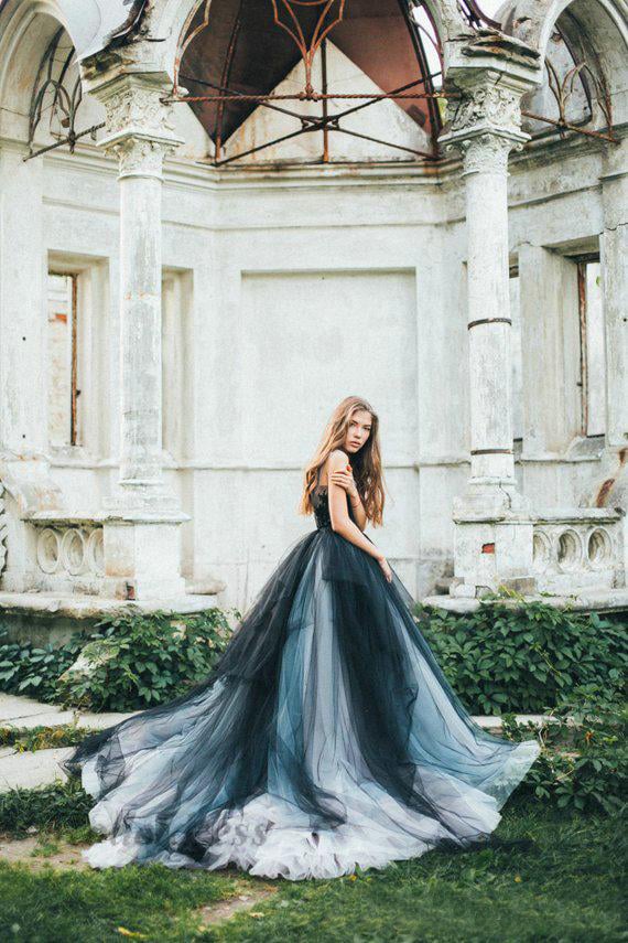 Gothic Wedding Dresses Colorful Tulle Black Navy Open Back Lace Appliques Sheer Neck Country Wedding Gowns Fashionable Design Bohemian Style