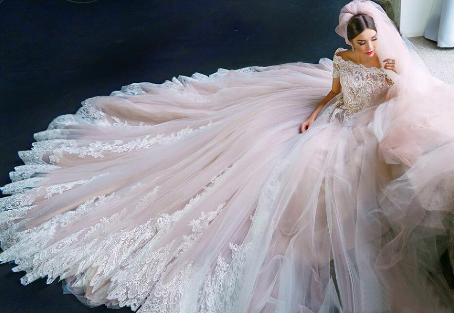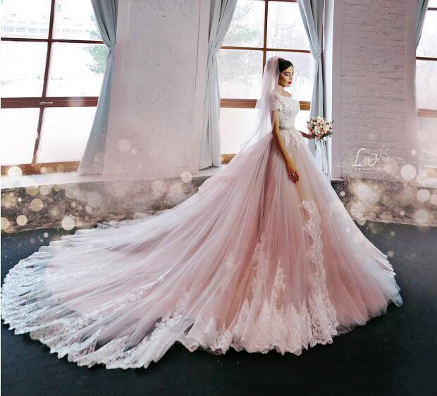 New Blush Elegant Princess A-Line Wedding Dresses Off Shoulders Cap Sleeves Lace Appliques Luxury Bridal Gowns with Court Train