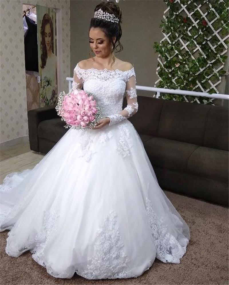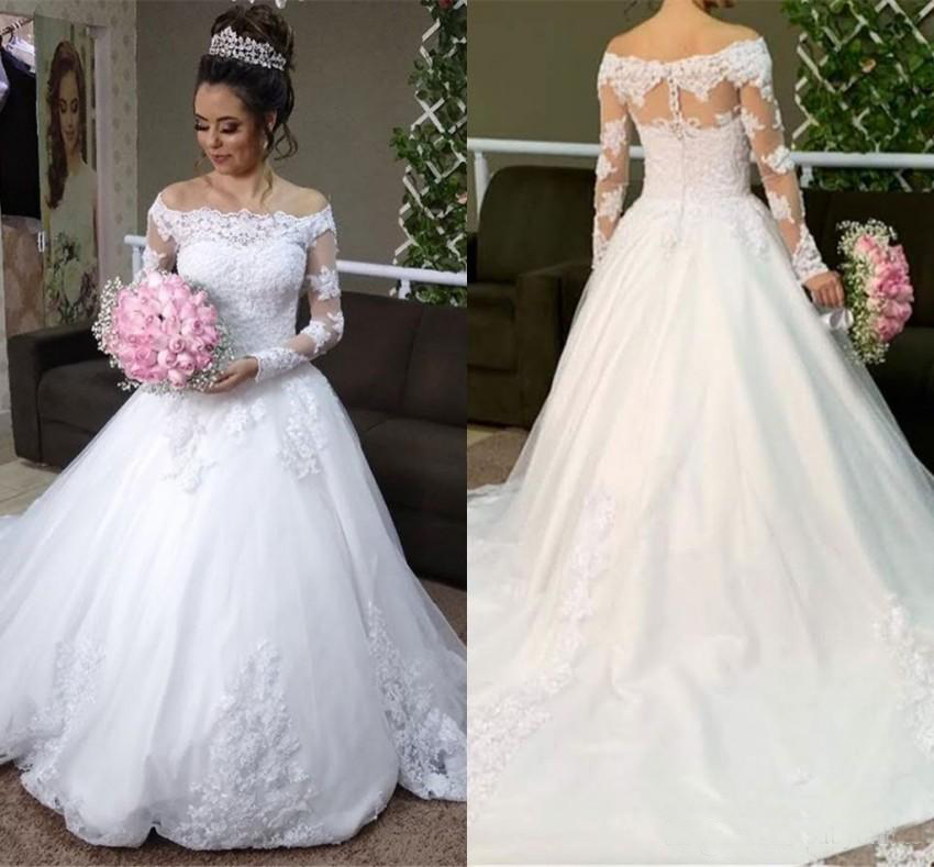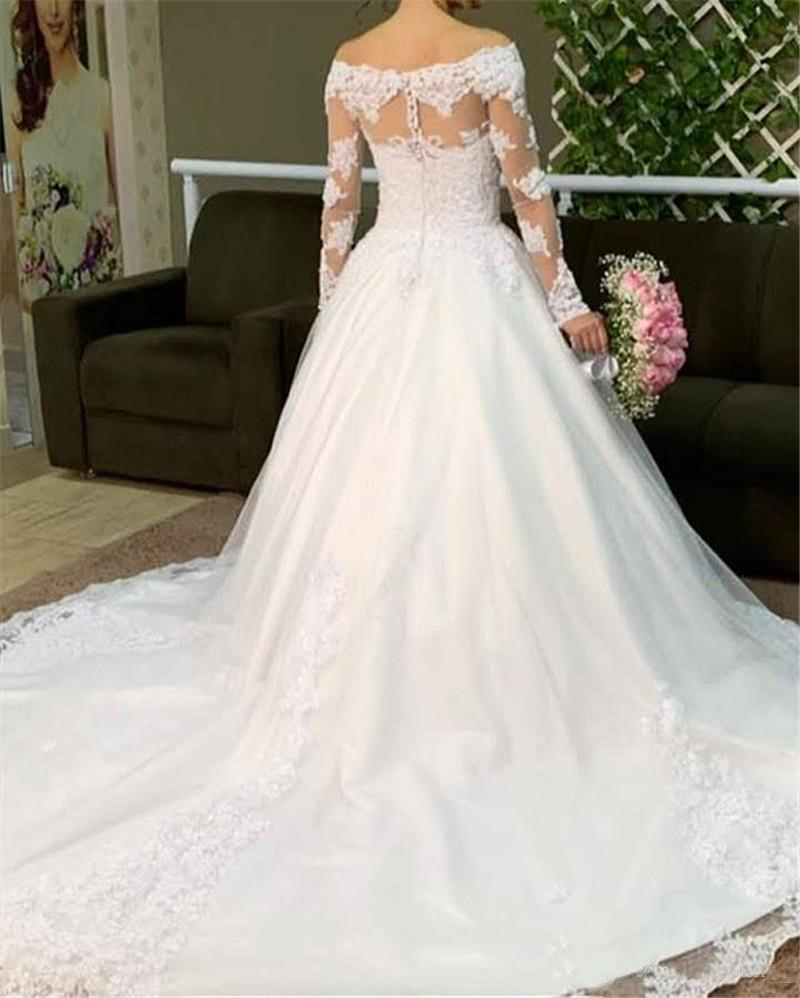 Modest Sheer Long Sleeve Arabic Wedding Dresses Appliques Lace Bridal Gowns With Button Covered Back A Line Robe