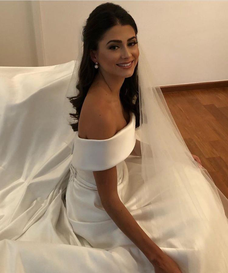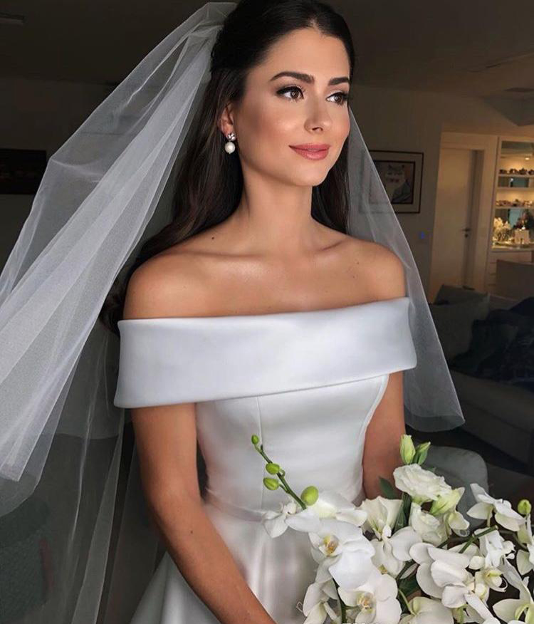Elegant Bateaux Neck Satin A Line Wedding Dresses Off The Shoulder Sweep Train Wedding Bridal Gowns With Buttons Back
