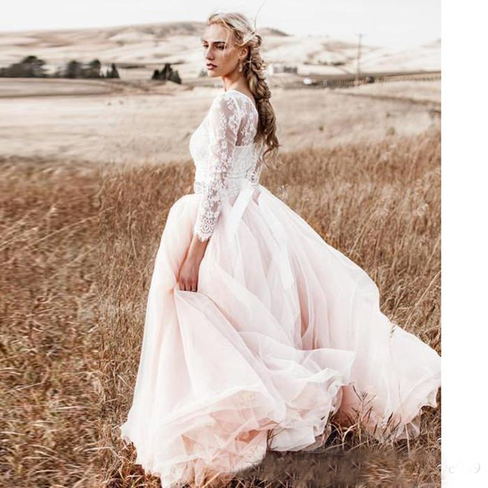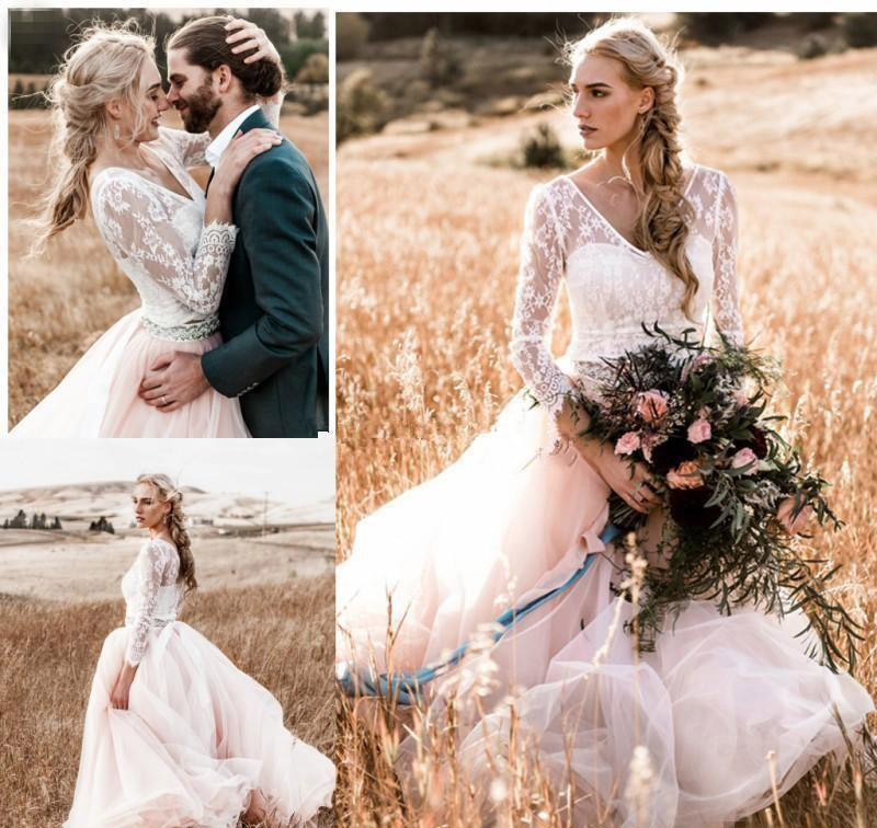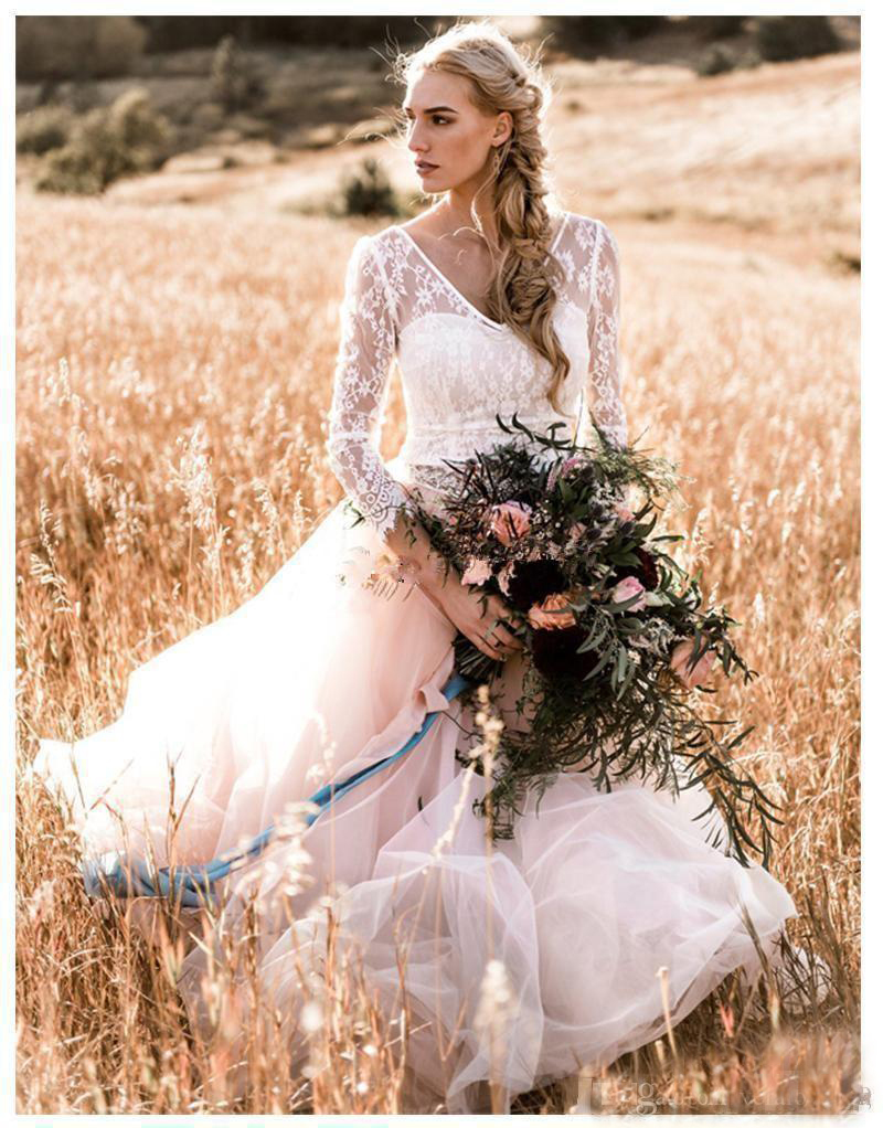 Full Lace Country Wedding Dresses A Line Long Sleeves Beach Bridal Gowns V Neck Tulle Sweep Train Garden vestido de novia