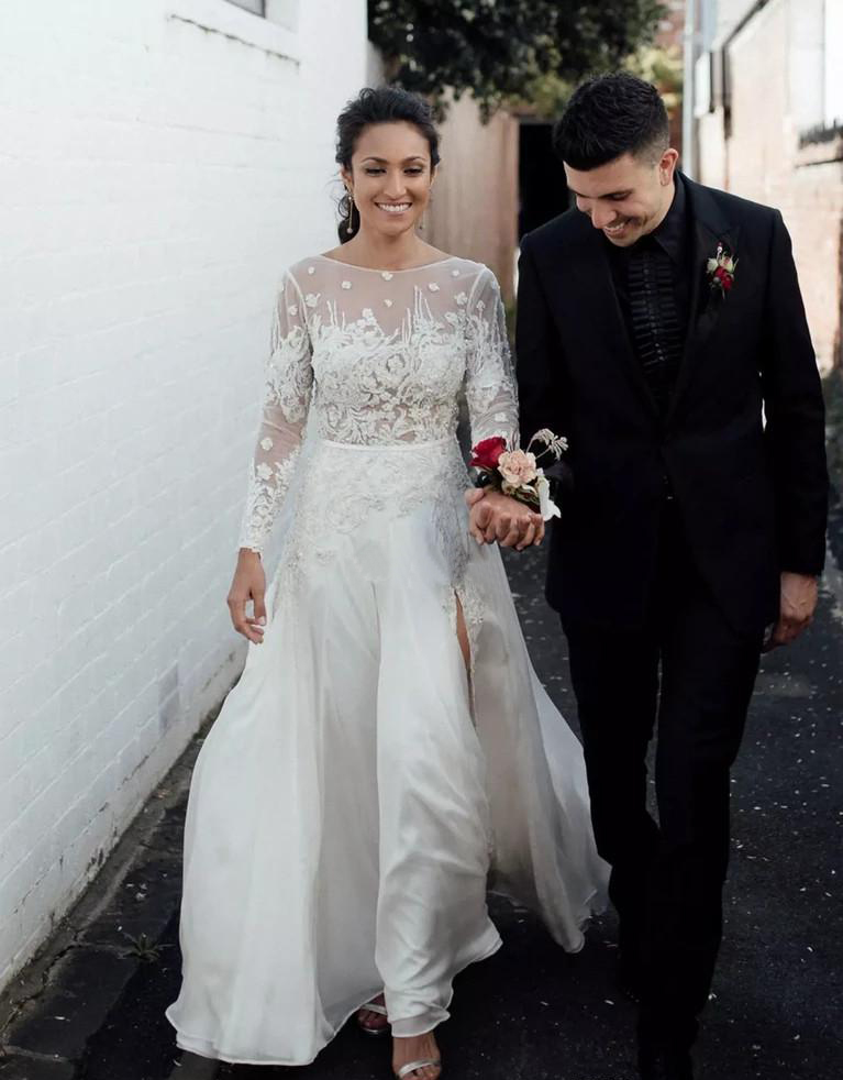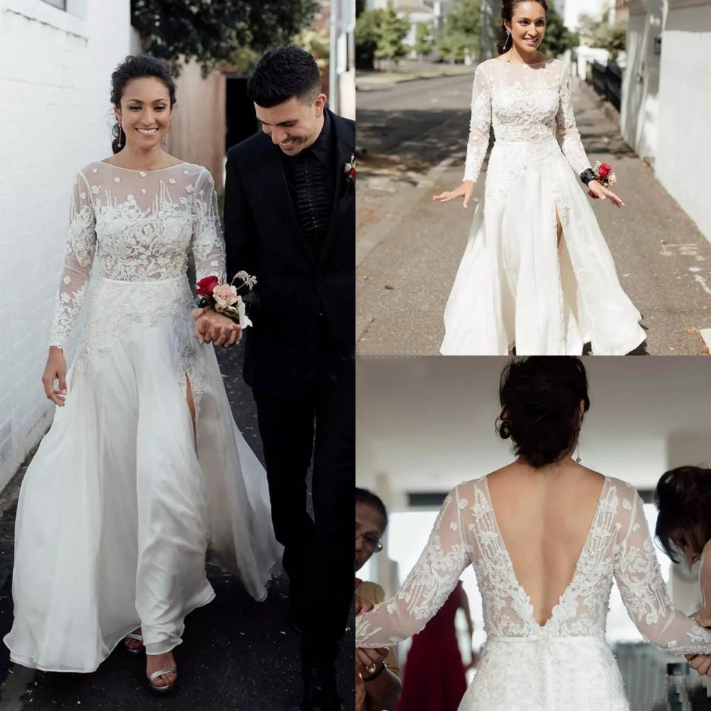 Lace Country Wedding Dresses With Illusion Long Sleeves High Side Split Backless Garden Brial Gown Stylish Church Vestidoe De Noiva