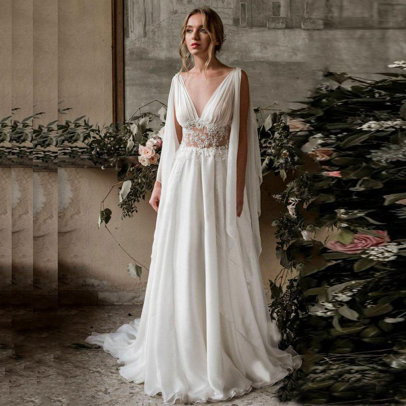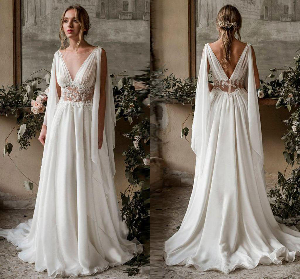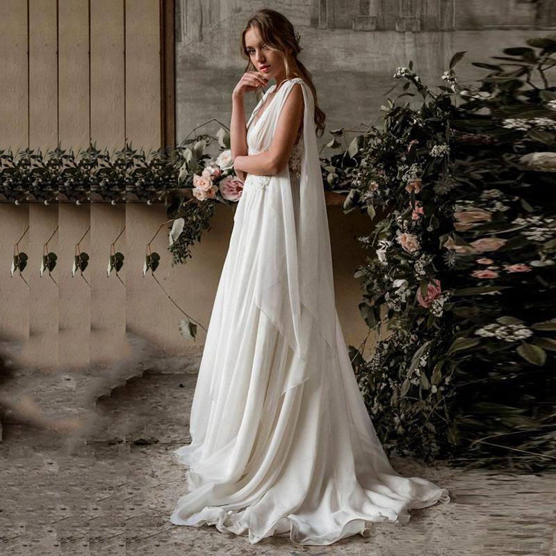 Chiffon Bomemian Wedding Dress Vintage V Neck Backless Lace Appliqued Beach Boho Bridal Gown