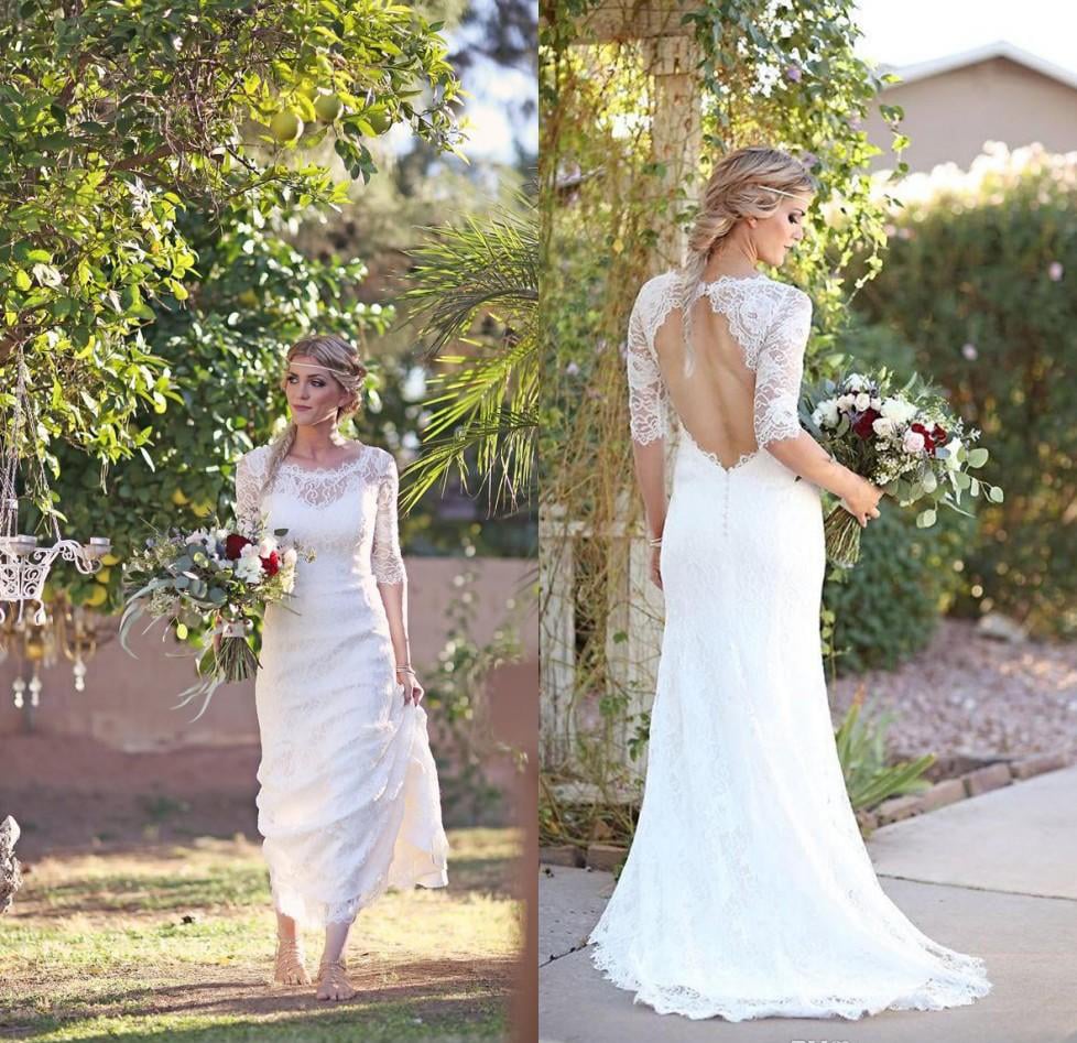 Long Sleevs Full Lace Sheath Bohemian Wedding Dresses Elegant Open Back Long Beach Boho Country Bridal Gown