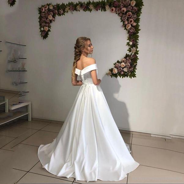Simple Country Wedding Dresses A Line Off Shoulder Satin Sweep Train Bridal Gowns For Beach Garden