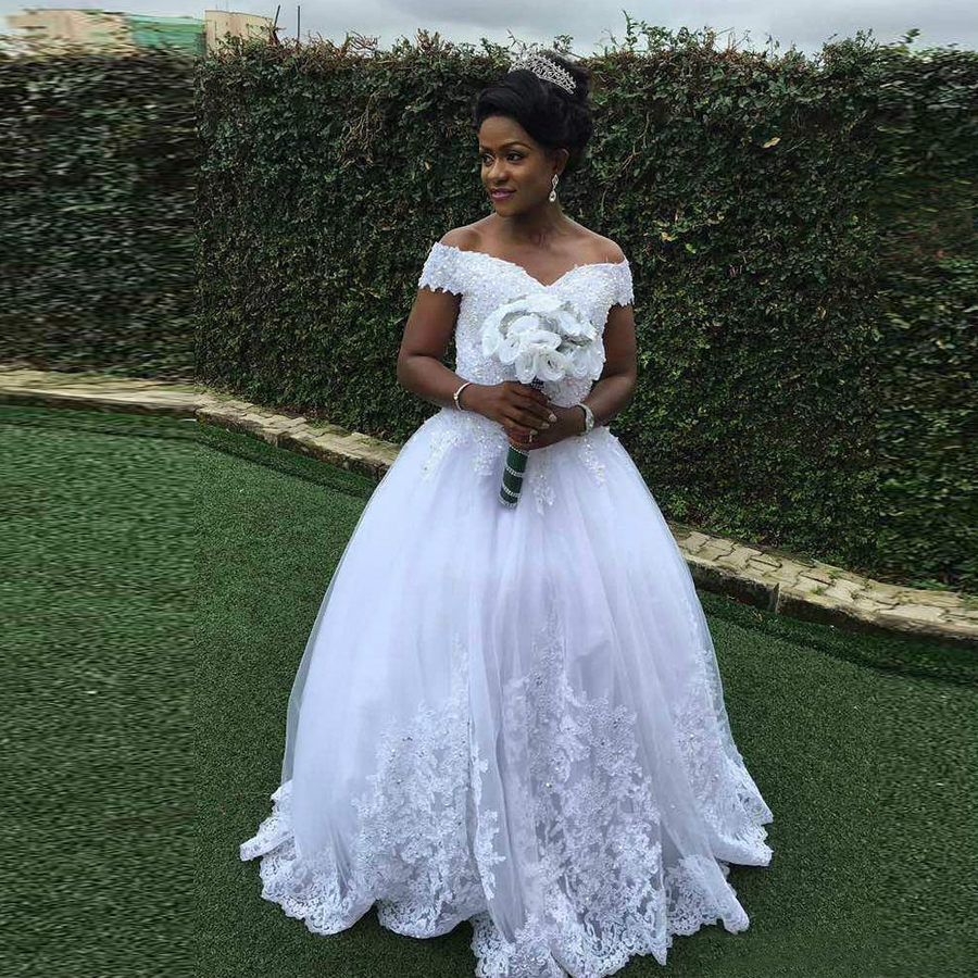 South African Off the Shoulder Tulle Gown With Appliqued Beaded White Wedding Dress Plus Size Lace Up Bridal Gowns For Bride