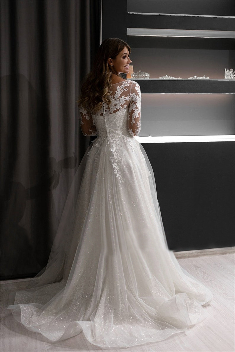 Elegant A-line Plus Size Tulle Wedding Dress Long Sleeve Lace Appliques Button Back Boho Beach Bridal Gowns