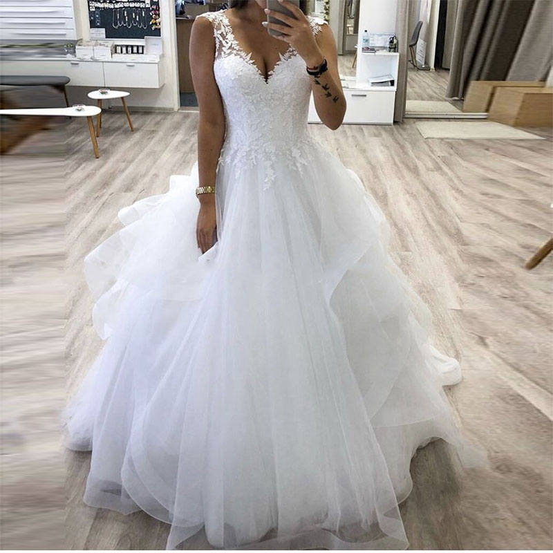 V-neck Princess Ball Gown Wedding Dress With Tiered Tulle Skirt White Customize Bride Dress Winter Bridal Gowns