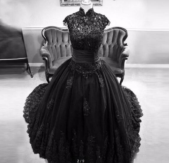 High Neck Cap Sleeve Black Wedding Dresses Lace Appliques Sequins Ball Gown Wedding Dresses Zipper Up Back Gothic Wedding Dresses