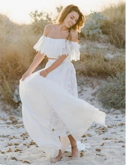 Beach Flowy Off the Shoulder Two Piece Lace Wedding Dress,Casual Bridal Separates
