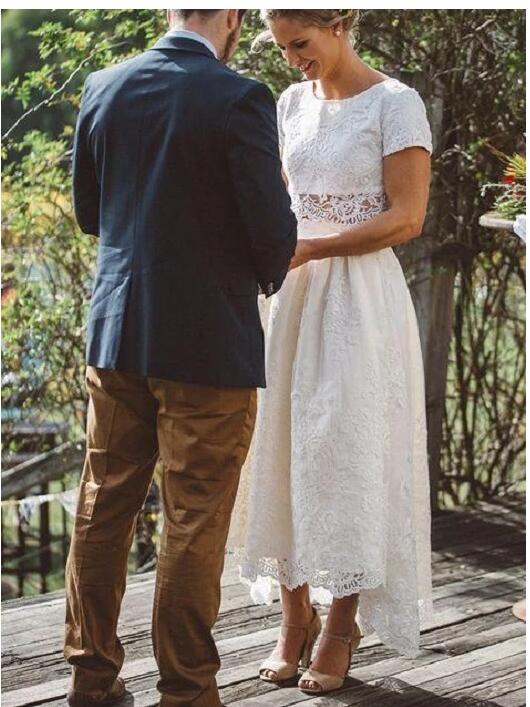 Bohemian Short Sleeves Lace Two Piece Hi-Lo Crop Top Wedding Dress