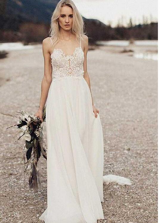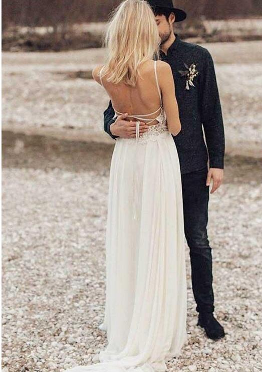 Boho Beach Chiffon Flowy Spaghetti Straps Backless Wedding Dress, Robe De Mariée