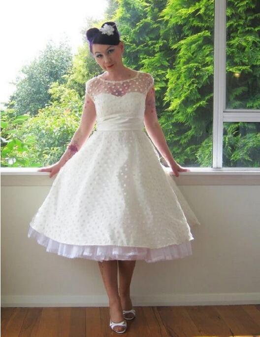 Cap Sleeved 1950s Style Tea Length Polka Dot Wedding Dress