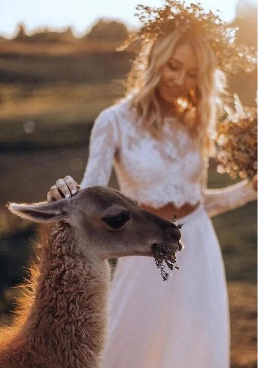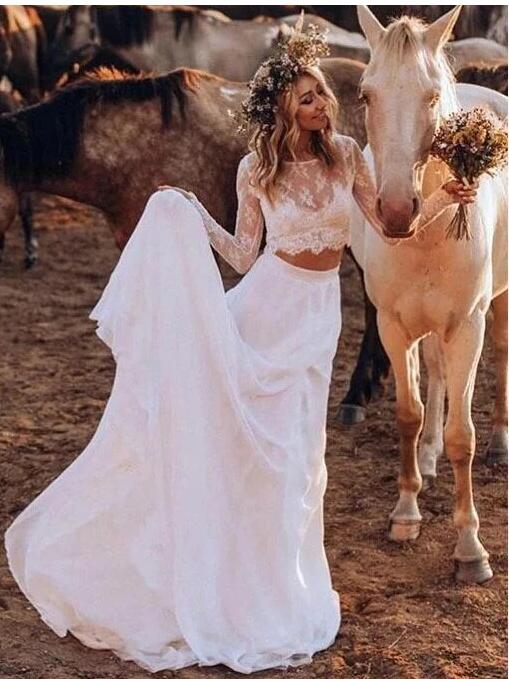 Casual Long Sleeve Lace Top Bridal Separates,Rustic 2 piece Crop Top Wedding Dress