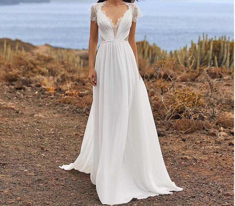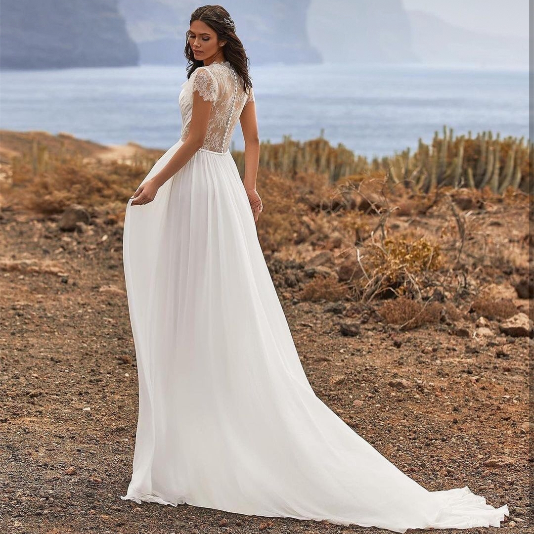 Long Elegant Wedding Dress 2023 Boho Chiffon Lace Cap Sleeve Bridal Bride Gown robe de mariée Bohemian Beach White Ivory Custom