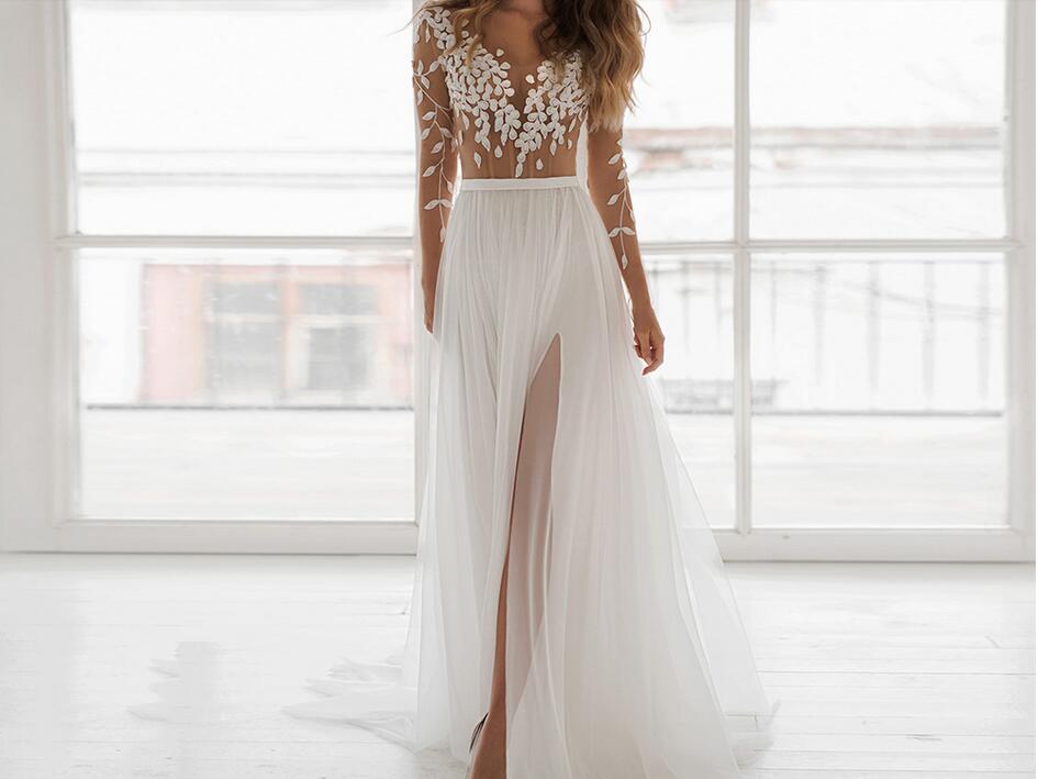 Simple Tulle Wedding Dresses Slit Applique Scoop Neck Sweep Train A-line Long Sleeve Bridal Gowns