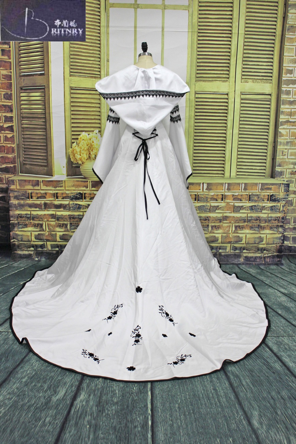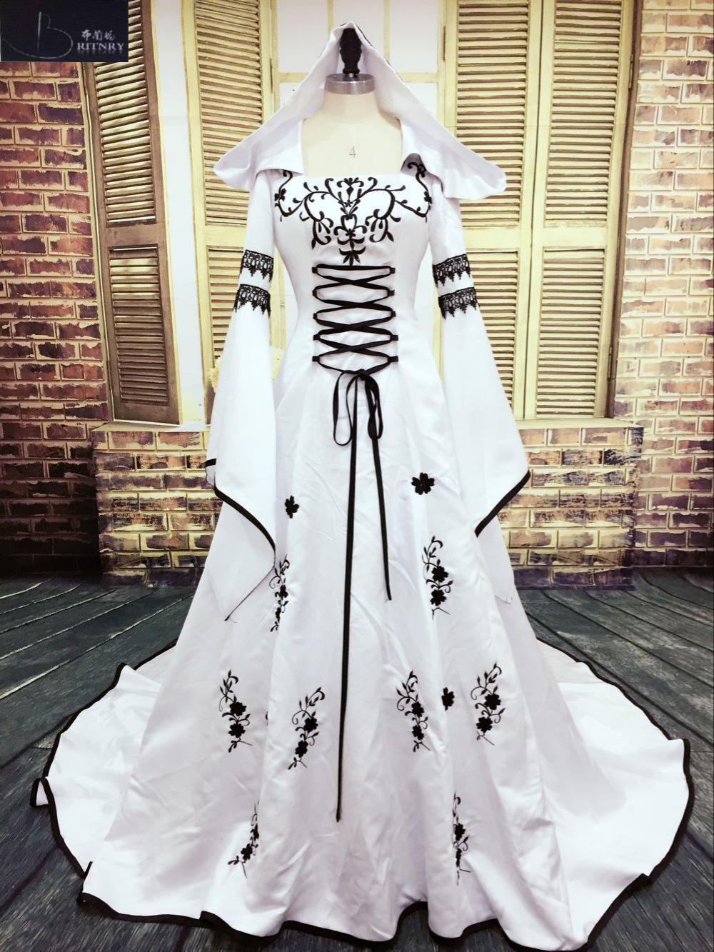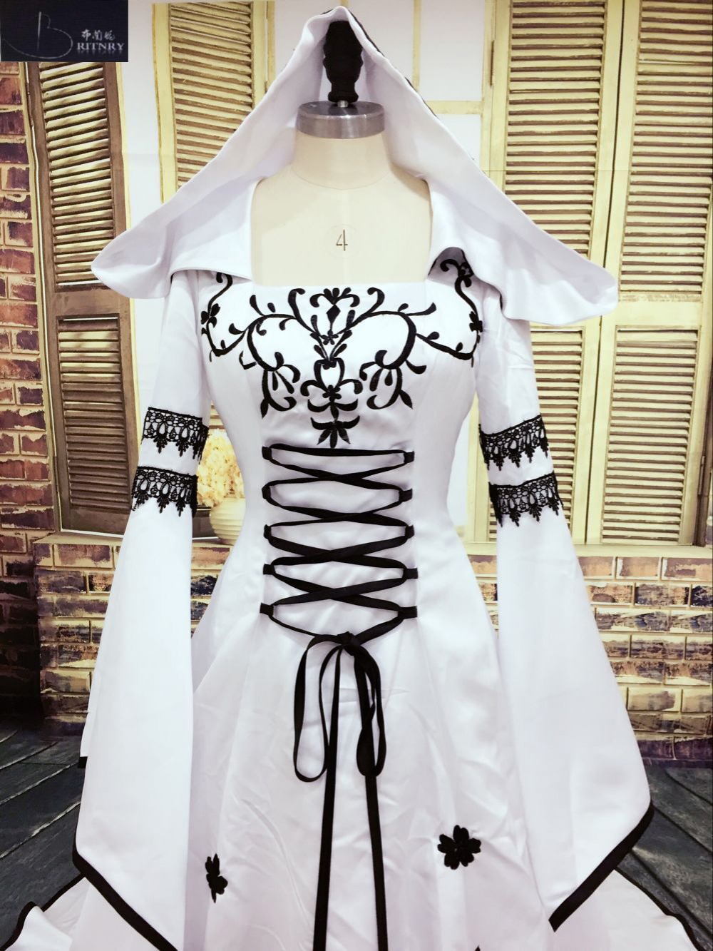 Medieval Wedding Dress Custom Made Bridal Dresses Embroidery A Line White And Black Satin Wedding Dress