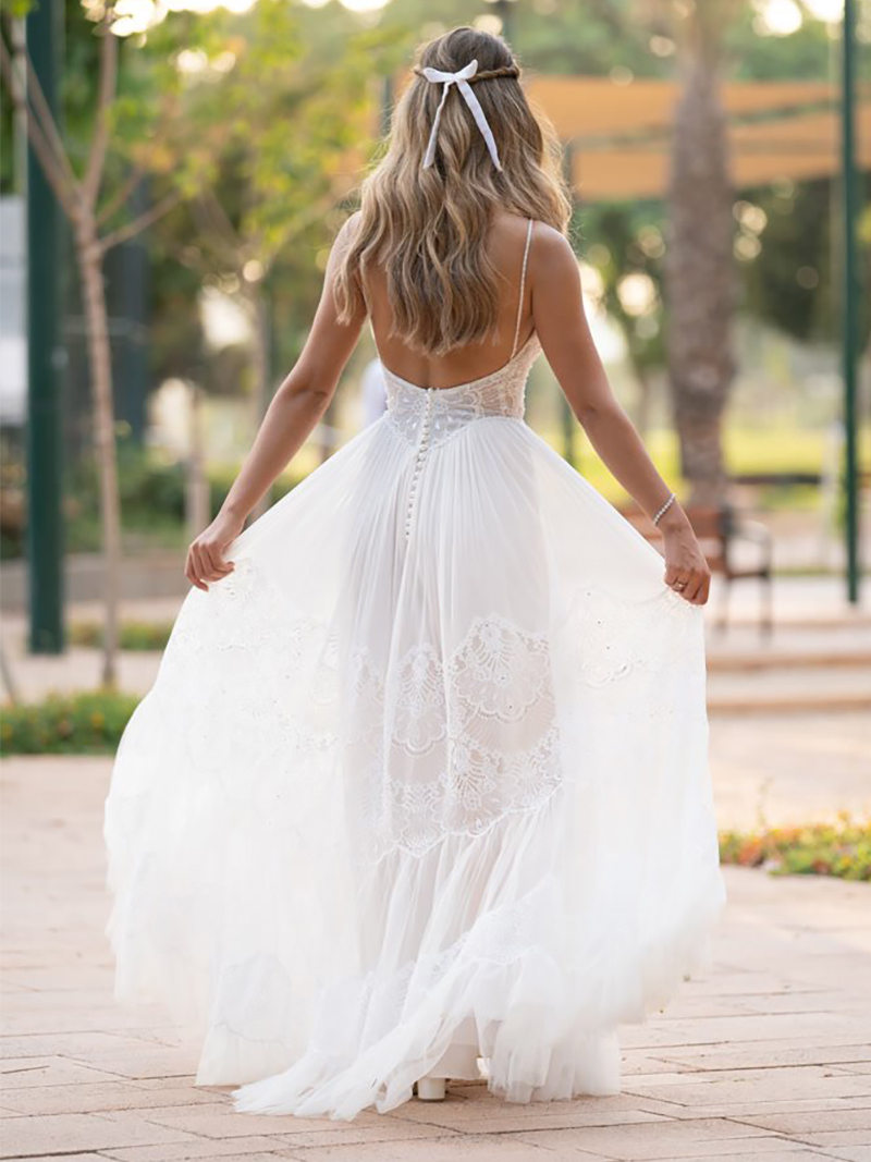 Beach Lace Tulle A Line Wedding Dress Spaghett Straps Backless Wedding Dress Bridal Dress