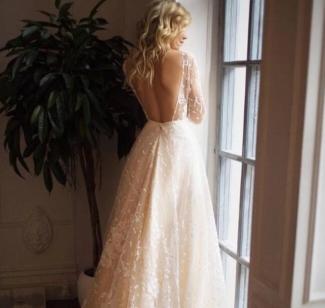 Wedding Dresses Backless A-line Long Sleeves Tulle Appliques Lace Boho Dubai Arabic Gown Bridal Dress Vestido De Noiva