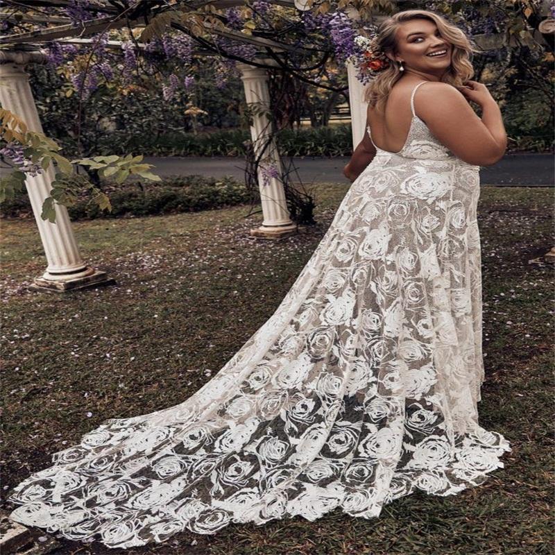 Bohemian A Line Full Lace Wedding Dresses Bridal Gowns Deep V Neck Sweep Train Backless High Side Split Country Style Boho Vestidos De Novia