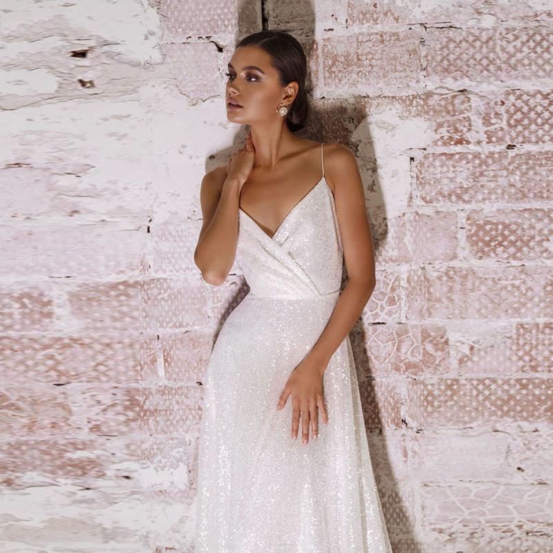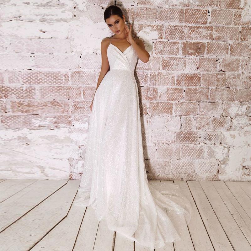 Glitter White Sequined Beach Wedding Dress 2023 Long Spaghetti Straps Bridal Gowns Sexy Backless Boho Bride Dresses