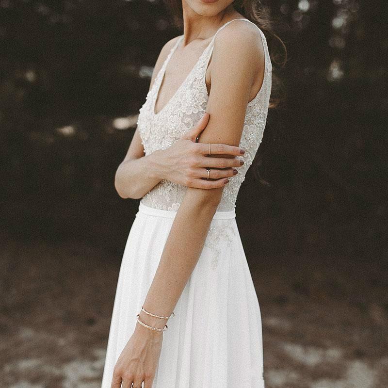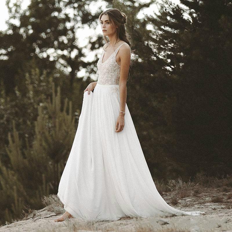 Beach Boho Wedding Dress Lace Beaded Flowing Chiffon A Line Sexy Deep V Neck Backless Bridal Gowns Sweep Train robes de mariée Country Brides Vestidos