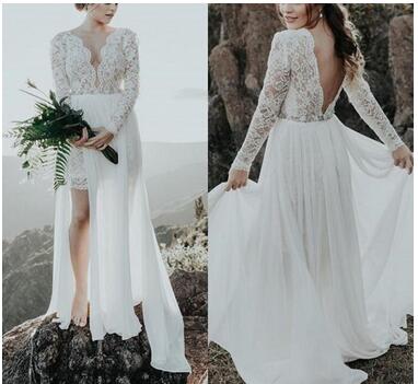 Summer Beach Wedding Dresses Backless Chiffon A Line Bridal Gowns Applique Lace V Neck Long Sleeves Short Boho vestide de noiva