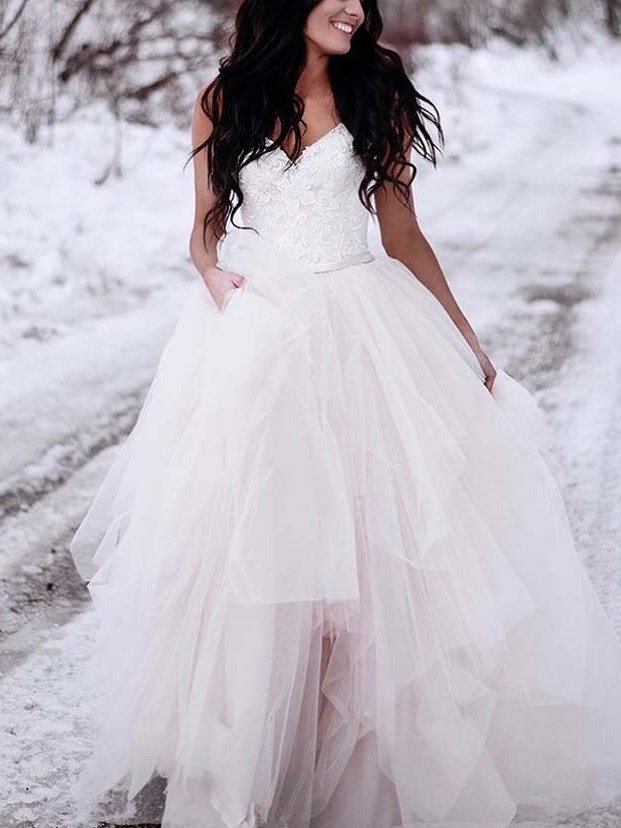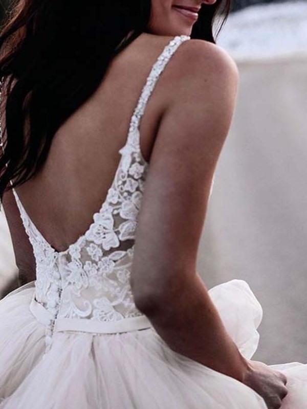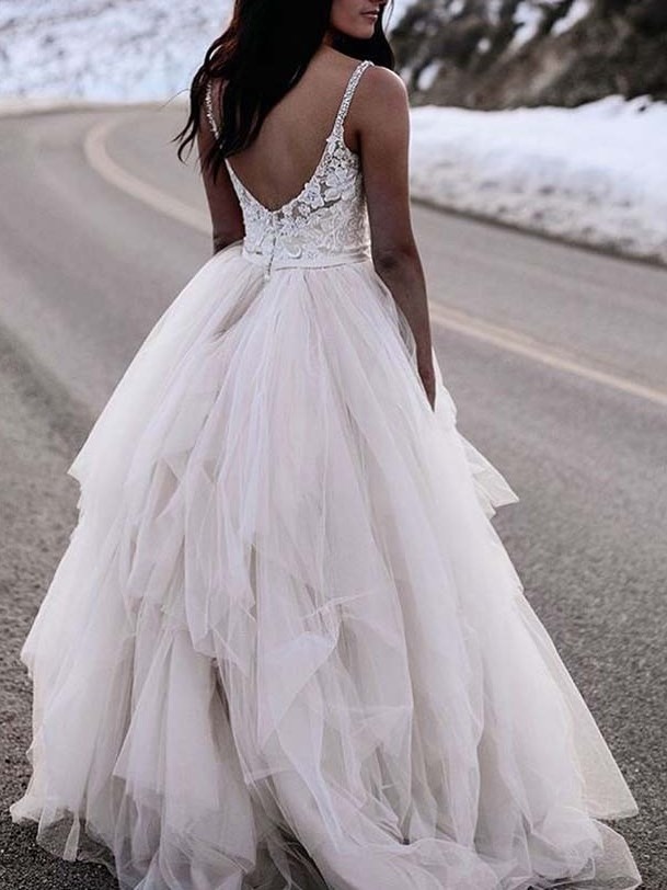 V-neck Rustic Wedding Dress, Open Back Tulle Wedding Dress Bridal Dress