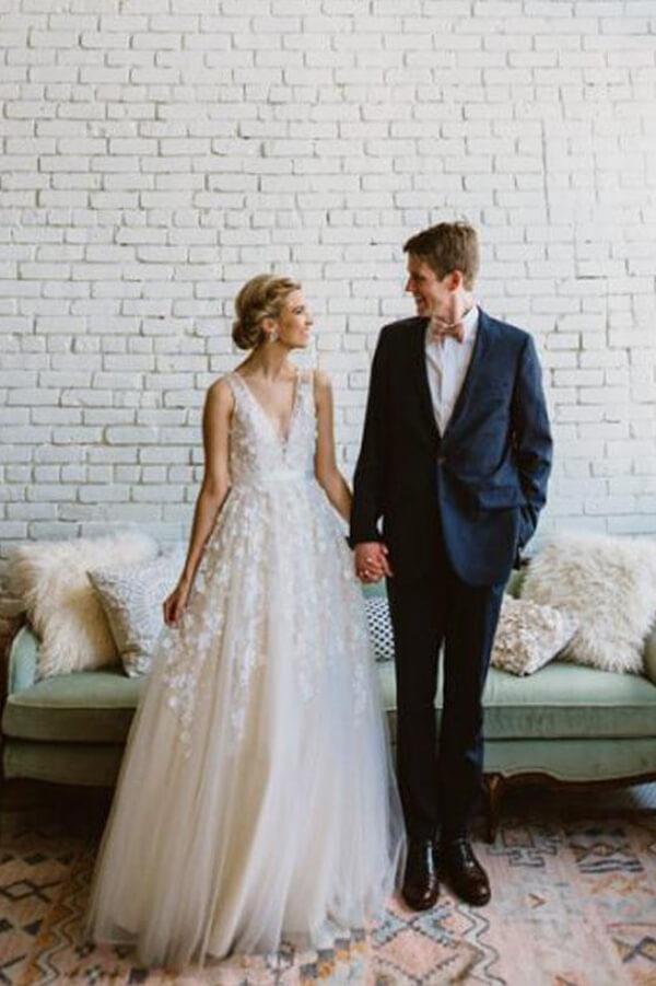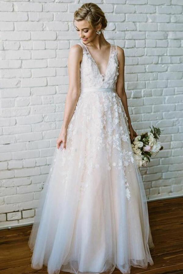 Fabulous Ivory V-neck Long Beach Wedding Dress with Lace Appliques