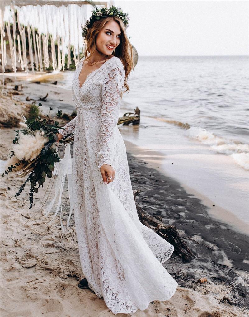 Vintage Lace Wedding Dress Boho A Line V Neck Long Sleeves Back Open Summer Beach Bridal Gown