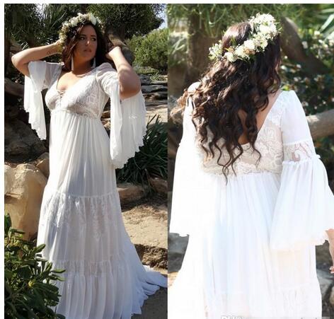 Charming Lace Beach Wedding Dresses V Neck Long Sleeves Plus Size Bohemian Bridal Gowns A Line Floor Length Chiffon Boho Robe De Mariée