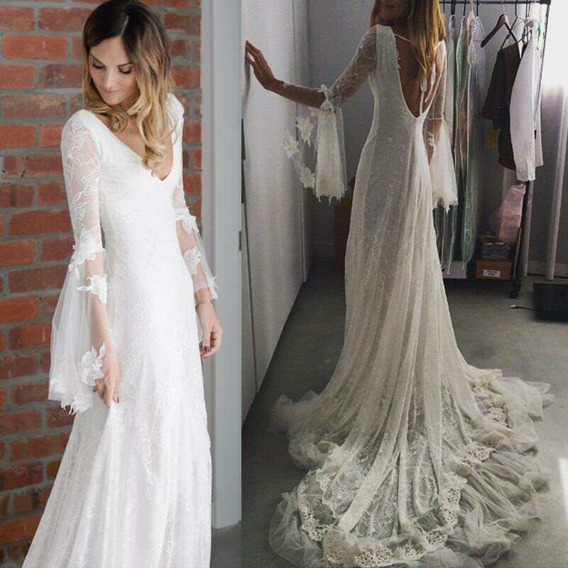 Boho V Neck Long Sleeves Lace Tulle Beach Wedding Dress Bridal Gown Bridal Dress