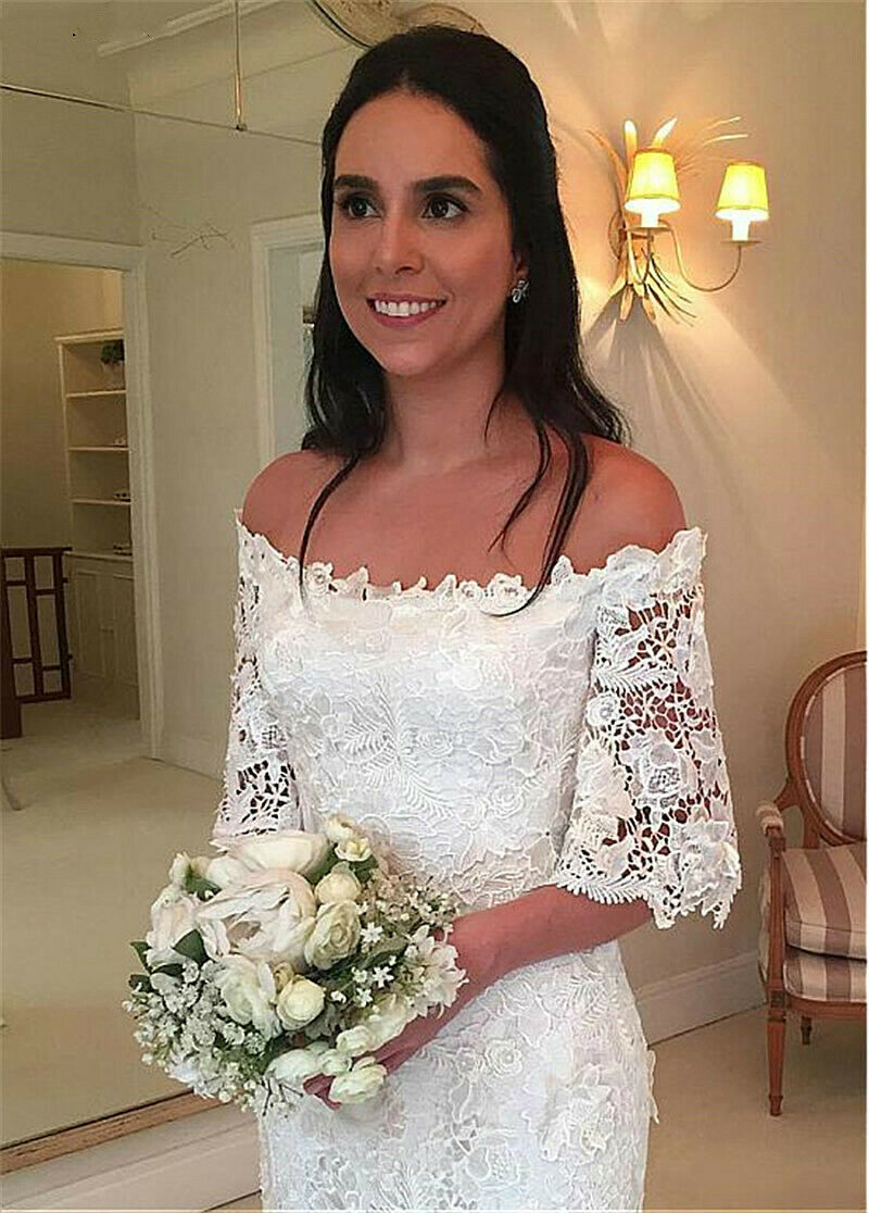 Lace Mermaid Wedding Dress Off Shoulder Half Sleeves Bridal Gown Sweep Train
