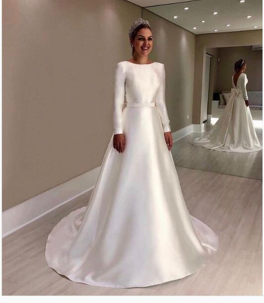 Elegant A-line Wedding Dress Crew Neckline Wedding Dress Satin Long Sleeves Open Back Wedding Gown