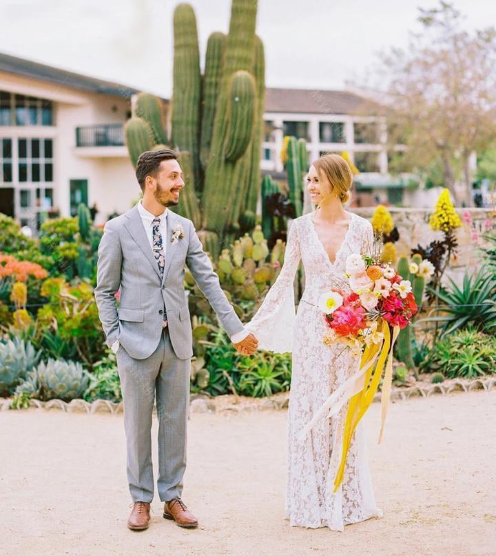 Lace Wedding Dresses 2021 V Neck Backless Long Sleeve Sweep Train Beach Garden Country Boho Bridal Gowns robes de mariee Plus Size vestidos