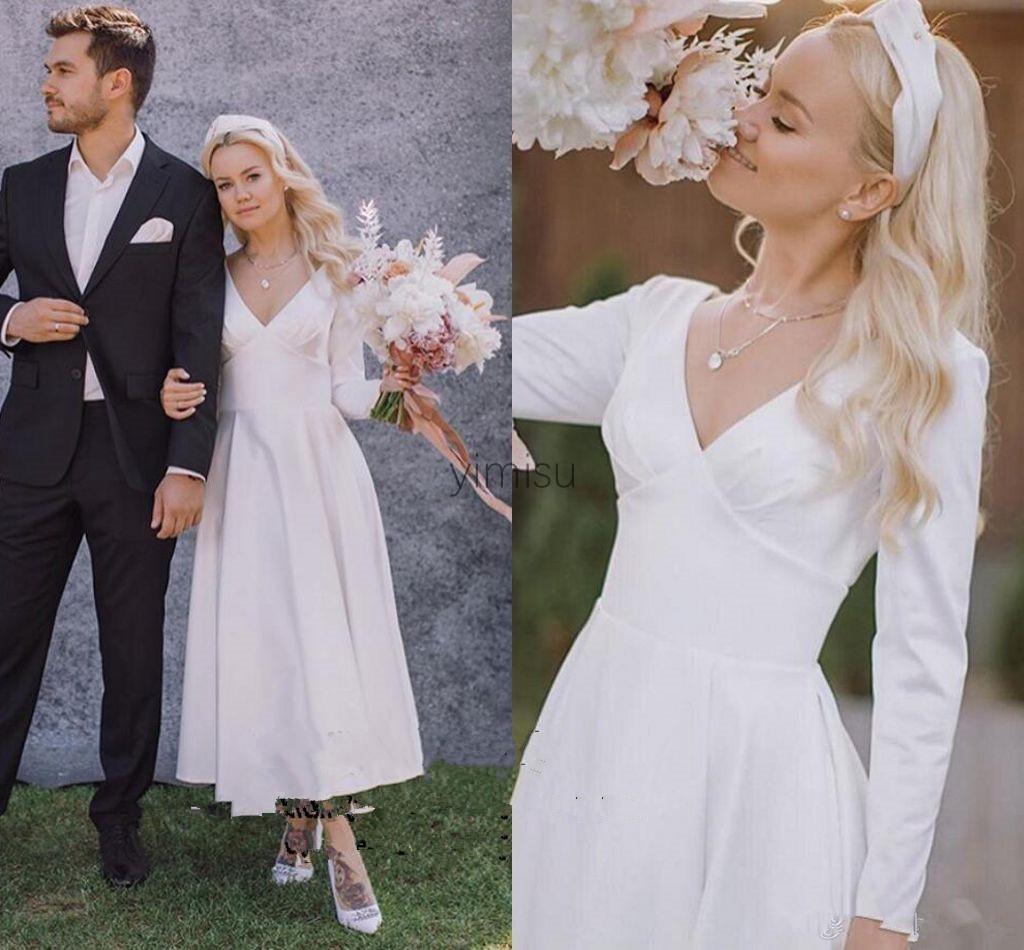 Tea Length Country Wedding Dresses V Neck Long Sleeve Garden Beach Bridal Gowns robes de mariée vestidos de novia Plus Size Cheap Simple