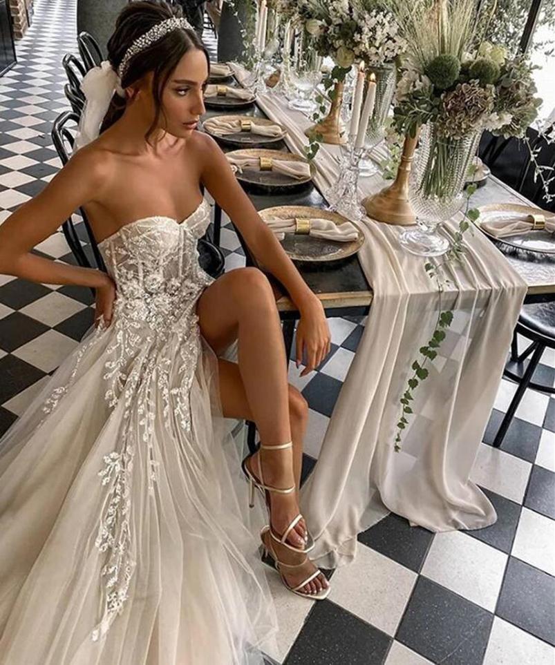 Strapless Split Lace A Line Wedding Dresses Sweep Train Lace-up Back Tulle Beach Bridal Gown