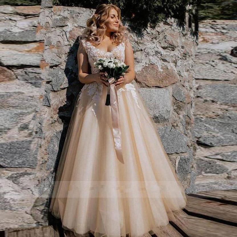 Country Garden Champagne A Line Wedding Dress Lace Up Back V Neck Lace Appliques Bridal Gown Plus Size