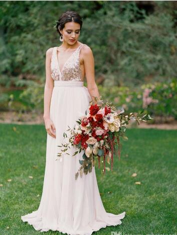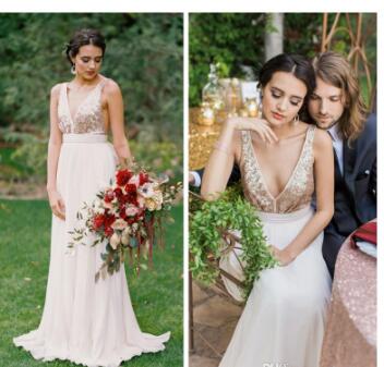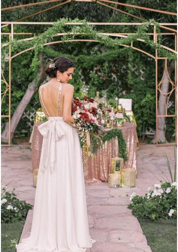 Rose Gold Sequinned Wedding Dress by Truvelle Floor Length Chiffon Pleats Sexy Back Wedding Gowns Custom