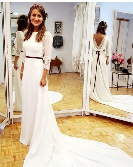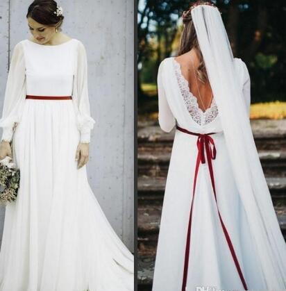 A-line Wedding Dresses Bridal Gowns Beach Bohemian White Long Sleeves Lace Chiffon Bridal Dresses With Sashes Sweep Train