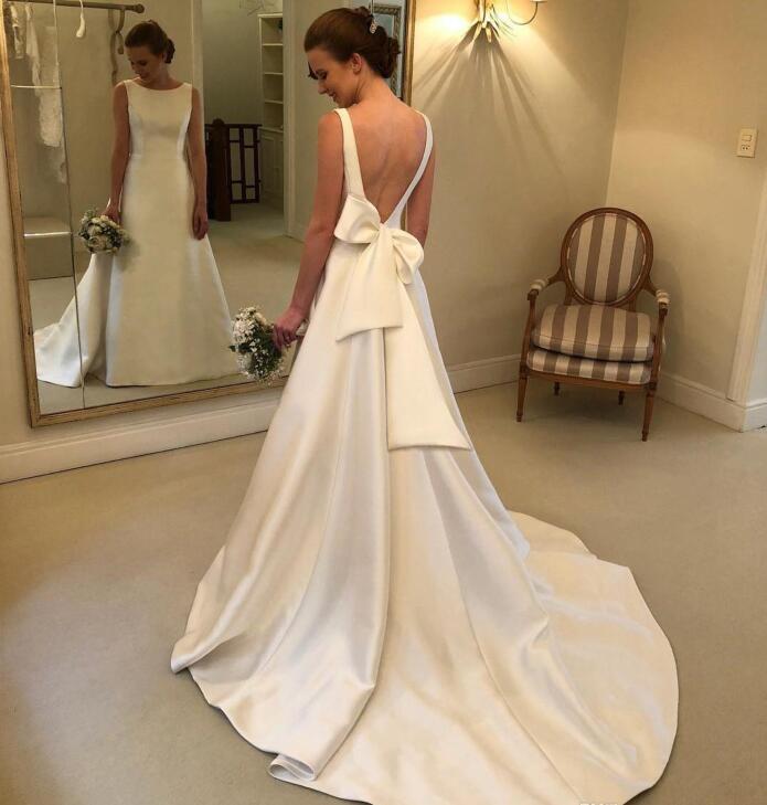 Simple A Line Backless Wedding Dresses Bateau Neck With Bow Tie Cheap Bridal Gown