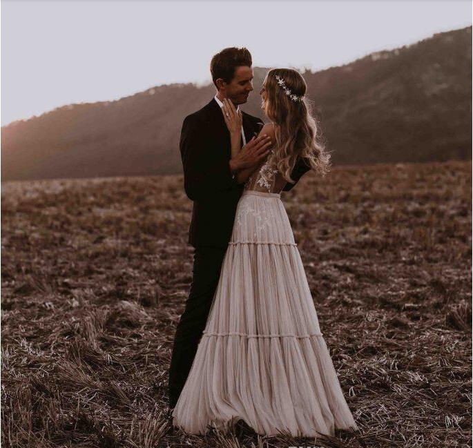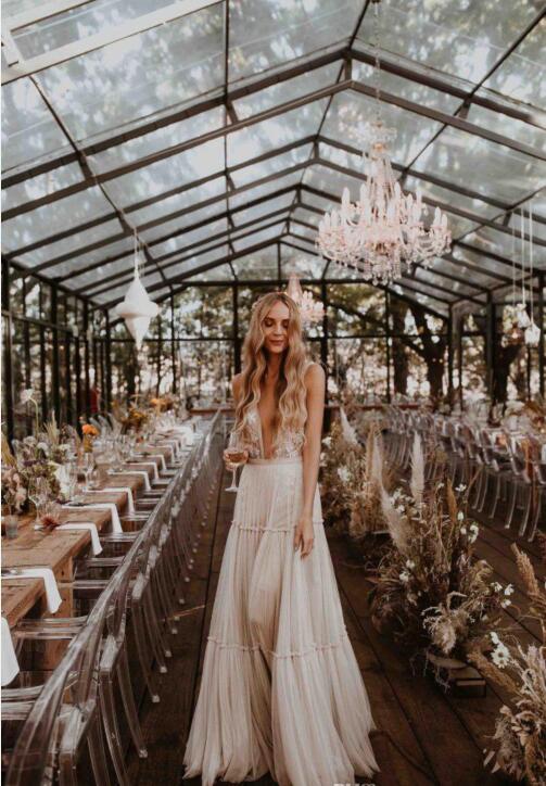 Fabulous Lace Boho Backless Wedding Dresses A Line Deep V Neck Beach Bridal Gown