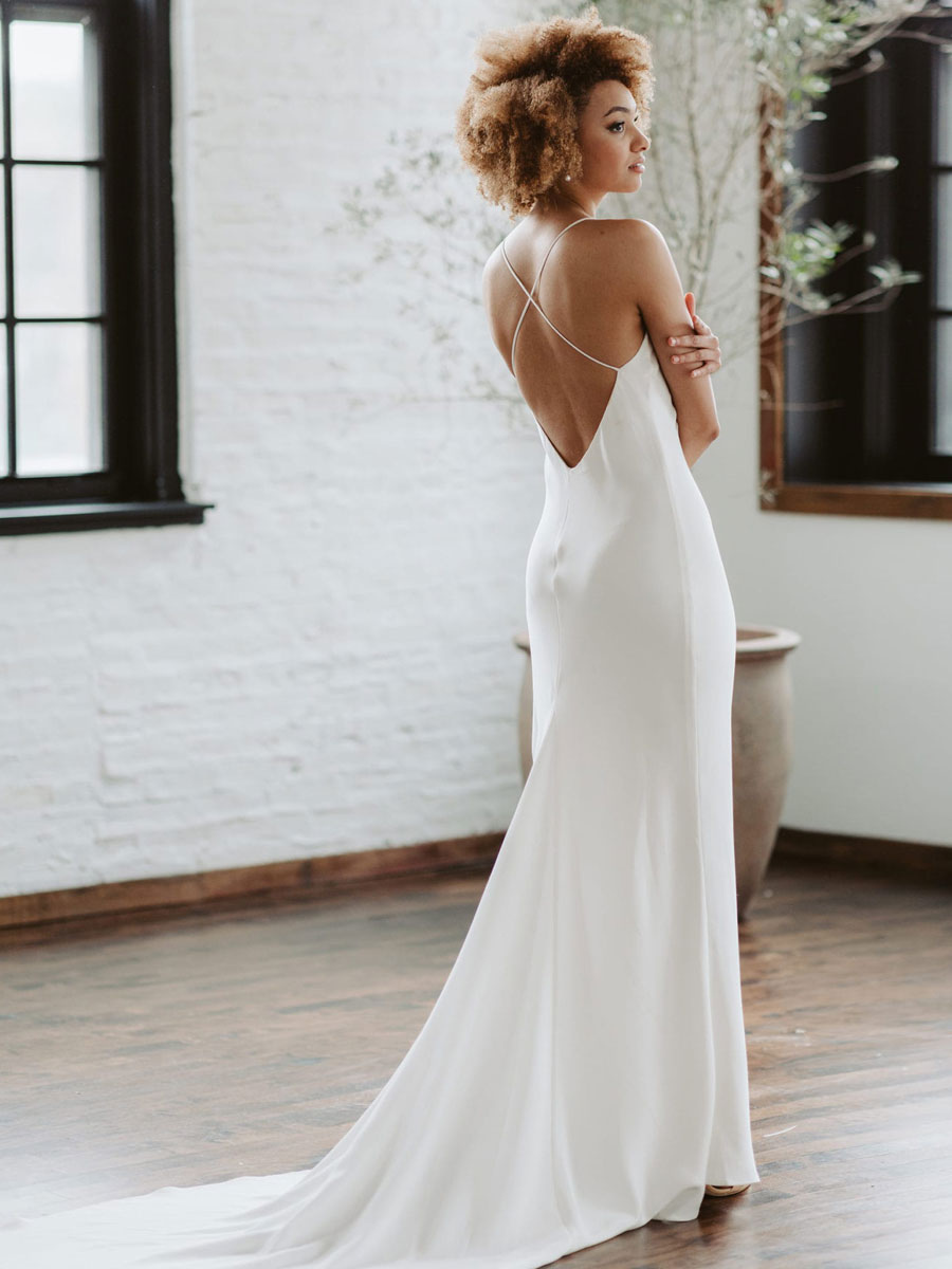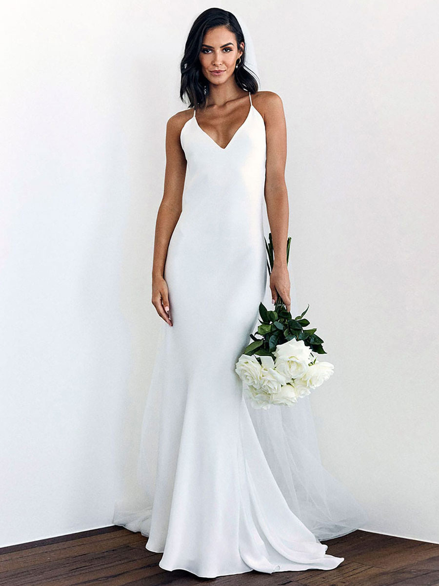 White Simple Wedding Dress Mermaid V-Neck Sleeveless Criss-Cross Spaghetti Straps Lace-Up Backless Satin Fabric Long Bridal Dress