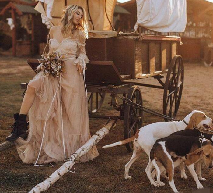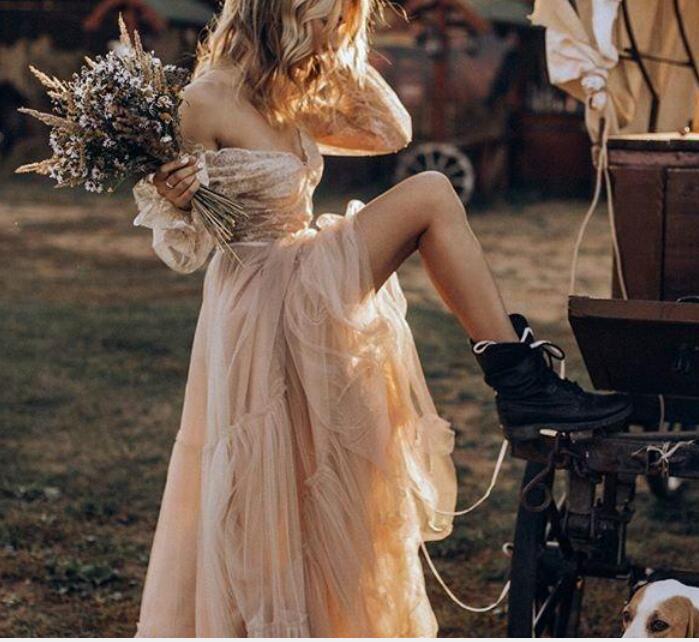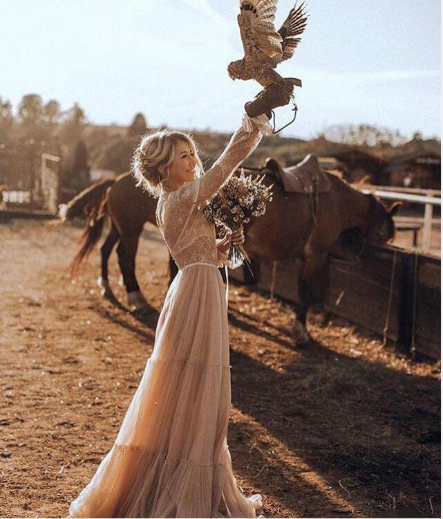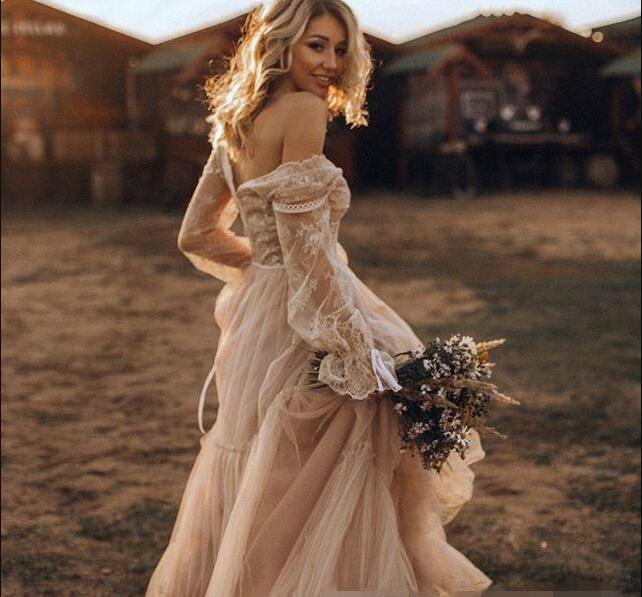 Long Sleeves Country Wedding Dress Lace Patchwork A Line Floor Length Off Shoulder Garden Wedding Gown